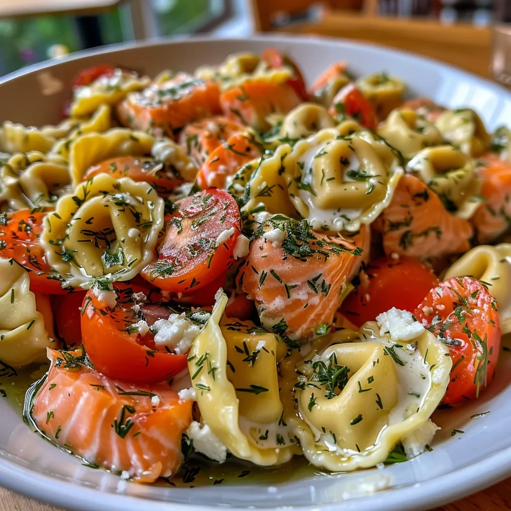 A quick and delicious meal perfect for two, combining salmon, tortellini, and fresh herbs in a creamy sauce.