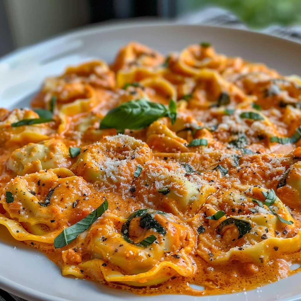 A rich and creamy pasta dish featuring tender tortellini in a flavorful tomato and garlic sauce, topped with Parmesan and fresh basil.